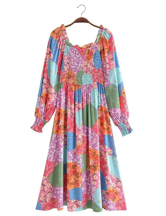 Didi's Boho, Elastic Bust, Trendy, Vintage, Stylish, Casual, Long Sleeves , Midi Dress