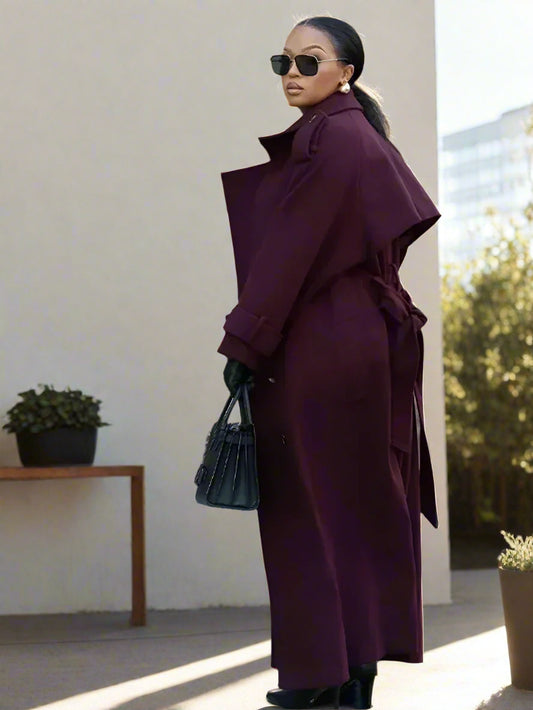 Caroline's Elegant, Burgundy, Wool, Long, Trendy, Stylish, Coat with Belt - Double Breasted Buttons