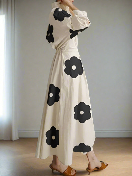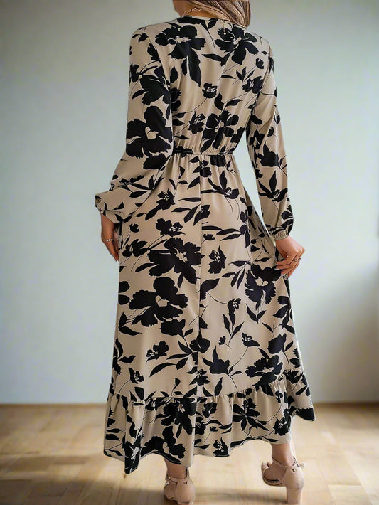 Vienna's Floral Print, Trendy, Stylish, Vintage, Elastic Waist, Long Sleeves, Pullover, Robe, Midi Long Dress