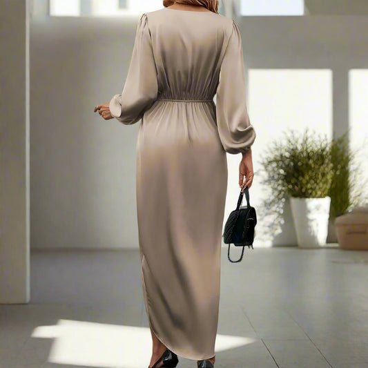Ann's Cross-Neck, Trendy, Stylish, Elegant, Party, Elastic Waist, Asymmetric, Long Sleeves Dress