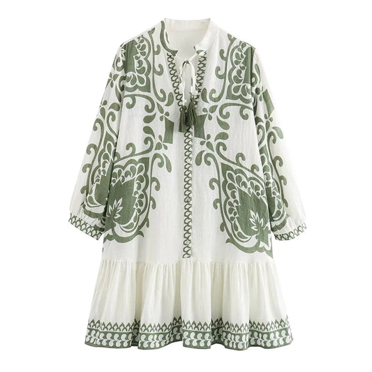 Tina's Boho, Printed, Loose, Vintage, Retro, Stylish, Elegant, Long Sleeves, Above Knee, Mini Dress