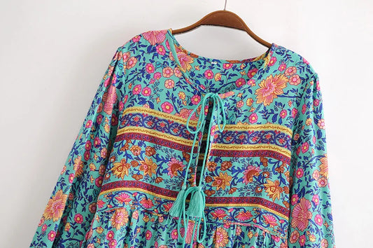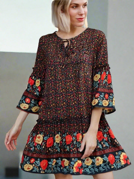 Yosra's Hippie, Vintage, Stylish, Trendy, Loose, Floral, Ruffles, Print, Floral, Bohemian, Mini Dress