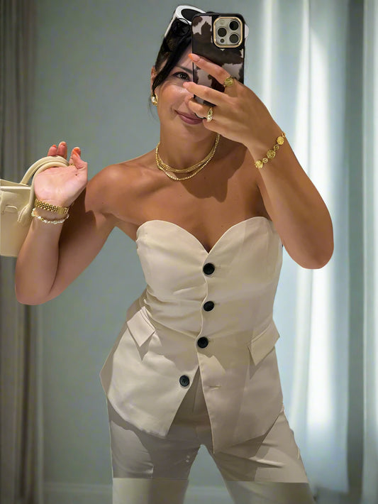 Ingy's Strapless, Trendy, Stylish, Vintage, Elegant, two pieces, Buttons, Long Pants, Outfit Set